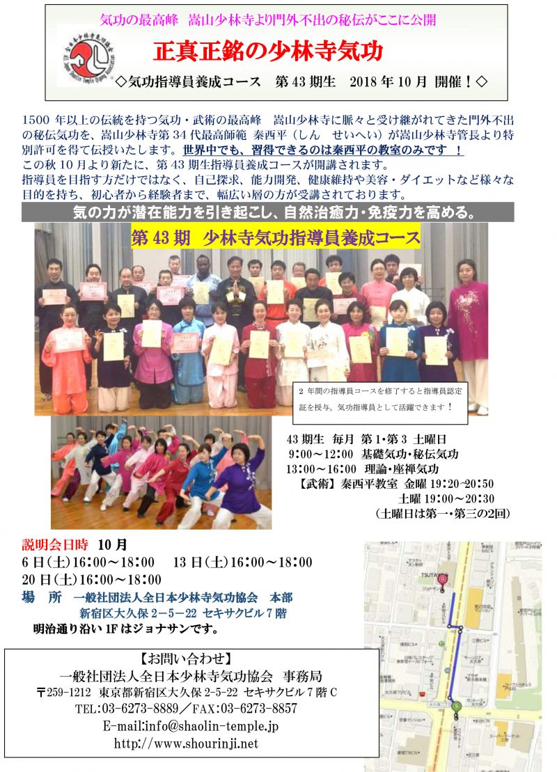 中国嵩山少林寺第三十四代最高師範・秦 西平が少林寺総本山の門外不出の気功法を伝授します!東京・新宿にて気功教室,武術教室,気功による施術を提供しております!全日本少林寺気功協会は日本に、世界に少林寺気功と少林武術を通して「少林功夫」「少林文化」の普及に努めています。
